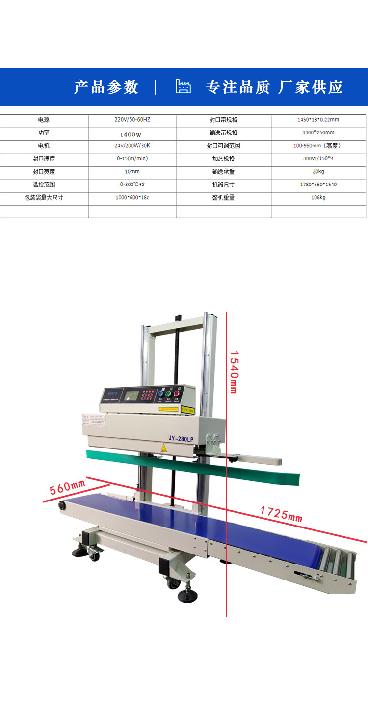 • 立式設計:這種封口機采用立式結構,機身通常為直立式框架,相較于臥式封口機,它在空間利用上更具優勢,適合在工廠車間的有限空間內進行布局。而且立式結構便于產品從上方或側面進料,對于一些大型、較高或較重的產品包裝,更易于操作和定位。