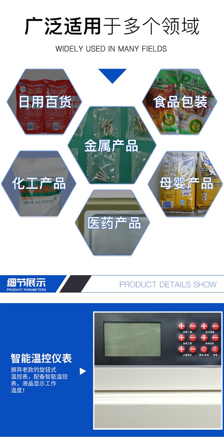 - 食品行業:在食品行業應用最為廣泛,用于各類食品的包裝封口,如餅干、薯片、糖果等小零食的包裝袋封口,以及肉類、海鮮、蔬菜等食品的真空包裝封口。可以保證食品的新鮮度和安全性,延長食品的保質期。