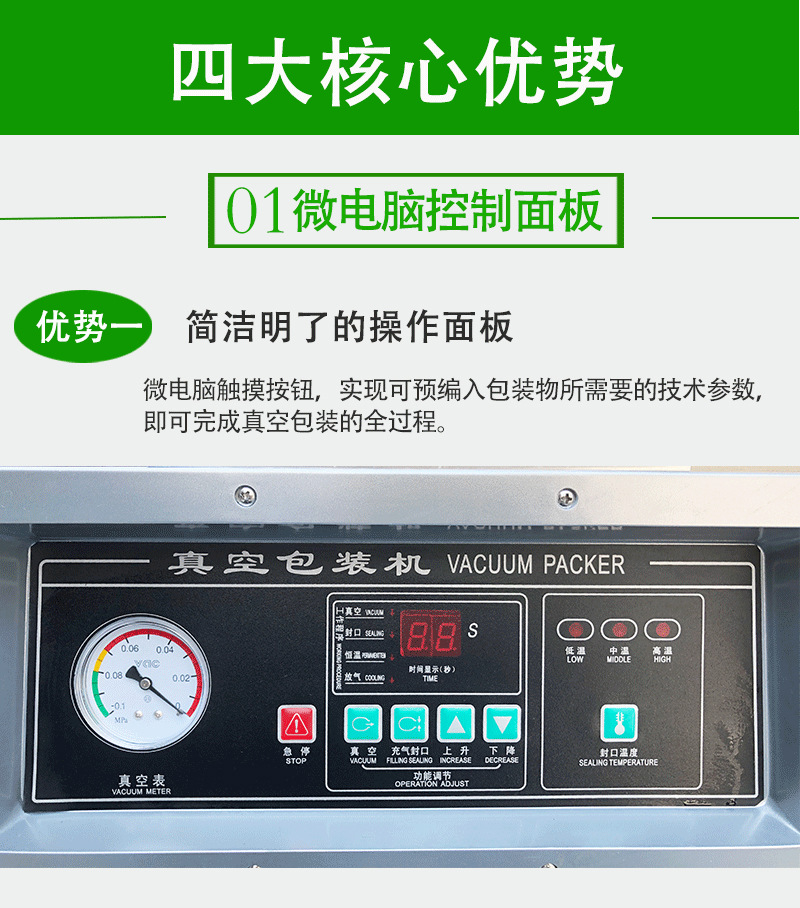 - 操作簡便:設備的控制面板設計簡潔直觀,各項參數調節一目了然,操作人員無需復雜培訓,即可快速上手,輕松完成真空包裝任務。
