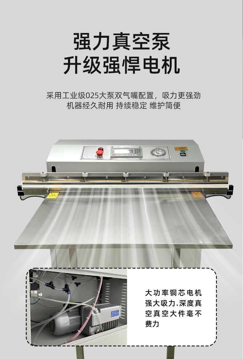 - 外抽式:一般采用立式結構,無密封真空室,由工作臺、抽氣裝置、封口裝置和控制系統等組成,結構較為簡單,占地面積小。