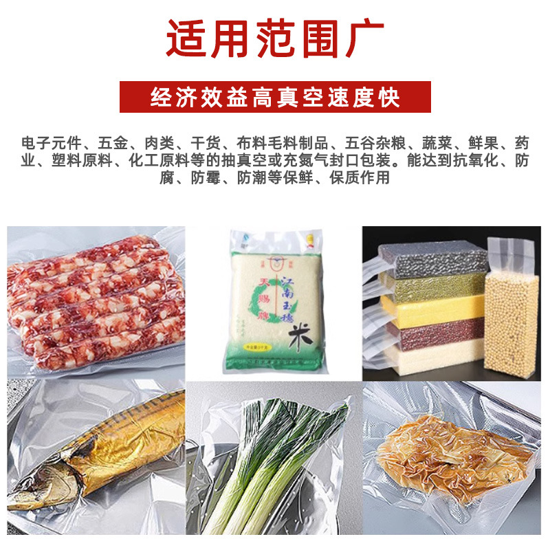 - 外抽式真空:適用于各種形狀和尺寸的包裝袋,不受包裝袋內(nèi)部物品形狀的限制。