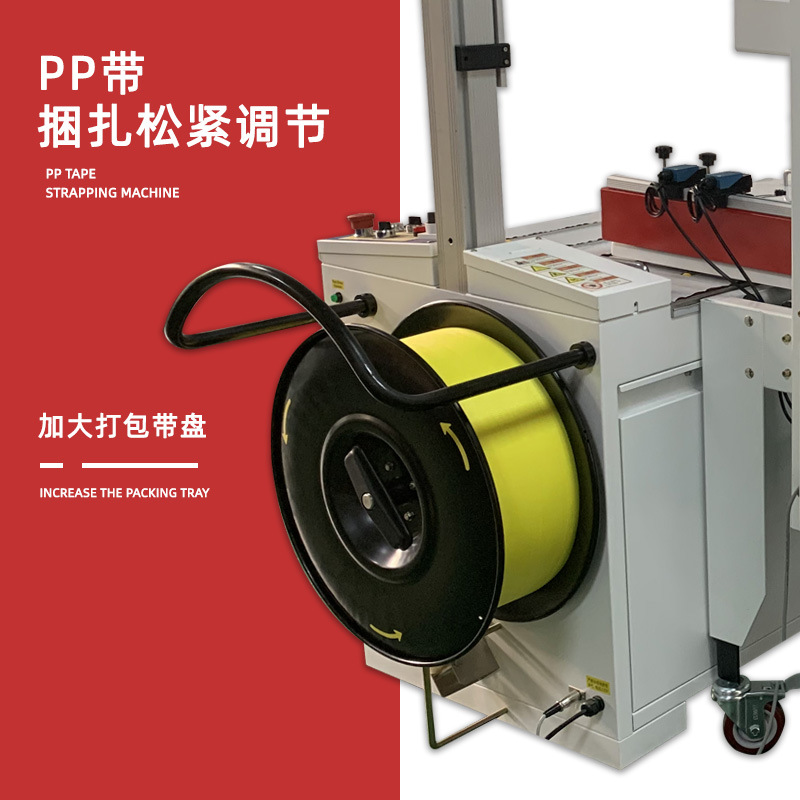 • 打包功能:在完成封箱后,機器接著會對紙箱進行打包操作。它會利用打包帶(如 PP 打包帶等)環繞紙箱,通過收緊裝置將打包帶拉緊到合適程度,再采用熱熔焊接(針對塑料打包帶)或其他固定方式(如鋼帶的卡扣固定等)將打包帶的兩端固定在一起,從而實現對紙箱的加固,以便于后續的搬運、堆疊等操作。
