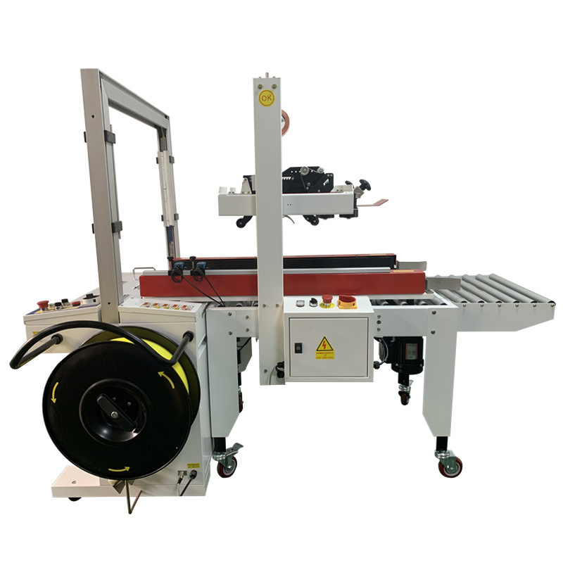 自動封箱打包一體機是一種集封箱和打包功能于一體的自動化設備,在現代物流、生產制造等眾多行業有著廣泛應用,以下為你詳細介紹: 一、工作原理 物品輸送:首先通過輸送帶等裝置將需要進行封箱打包的物品傳送到指定工作區域。 封箱操作:設備會自動將紙箱撐開并套在物品上(如果是已成型紙箱則直接進行后續步驟),然后通過封箱機構,使用膠帶等材料對紙箱的上下開口處進行粘貼密封。常見的封箱方式有一字型封箱(只封紙箱的一條棱邊)和工字型封箱(在紙箱上下開口的兩條棱邊都進行封貼,更加牢固)。 打包操作:在完成封箱后,接著進行打包工