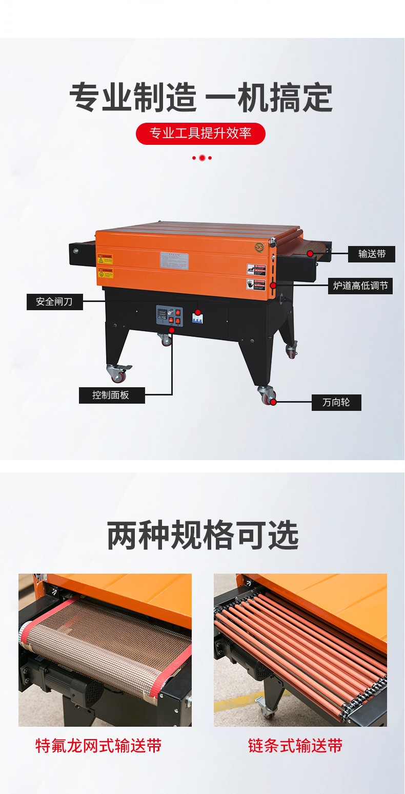 它主要是利用熱空氣循環的原理來工作。機器內部設有加熱裝置,能夠將空氣加熱到一定的溫度。然后通過強力的噴氣系統,將熱空氣均勻地噴射到被包裝物品的表面。當包裝薄膜(通常是熱收縮薄膜)受熱后,會產生收縮,從而緊密地貼合在產品的表面,達到良好的包裝效果。例如,在包裝飲料瓶時,熱收縮膜在熱空氣的作用下,緊緊地裹住瓶子,不僅可以使產品外觀更加整齊美觀,還能起到防塵、防潮等保護作用。
