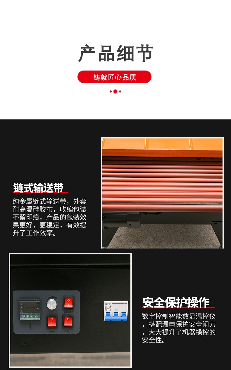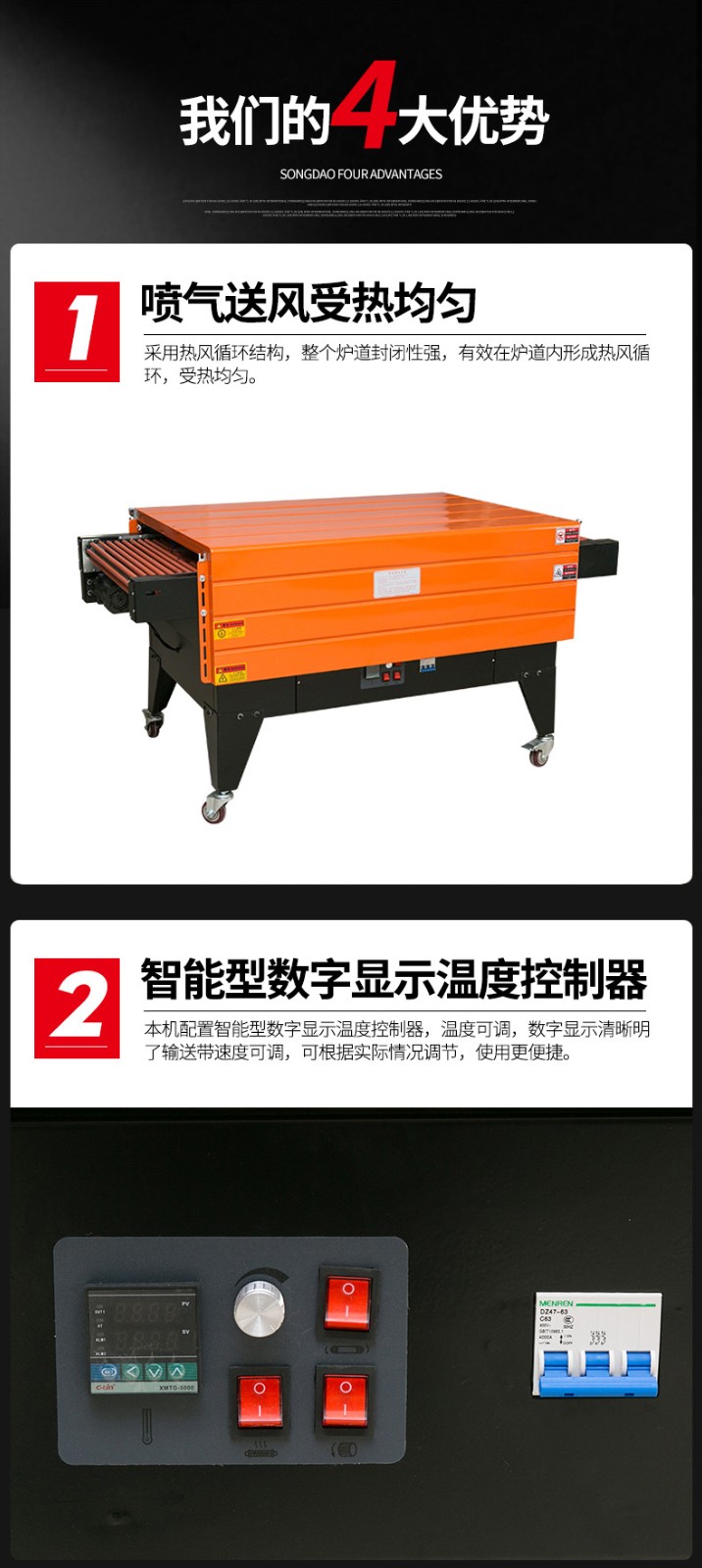 它主要是利用熱空氣循環的原理來工作。機器內部設有加熱裝置,能夠將空氣加熱到一定的溫度。然后通過強力的噴氣系統,將熱空氣均勻地噴射到被包裝物品的表面。當包裝薄膜(通常是熱收縮薄膜)受熱后,會產生收縮,從而緊密地貼合在產品的表面,達到良好的包裝效果。例如,在包裝飲料瓶時,熱收縮膜在熱空氣的作用下,緊緊地裹住瓶子,不僅可以使產品外觀更加整齊美觀,還能起到防塵、防潮等保護作用。