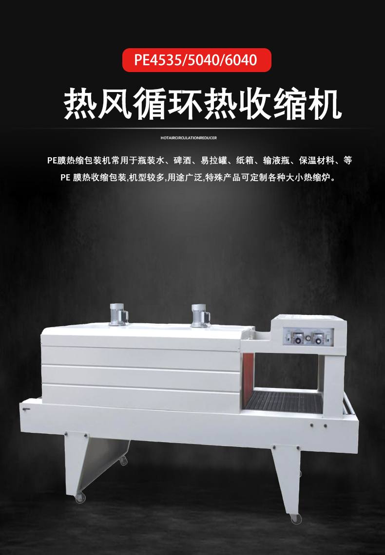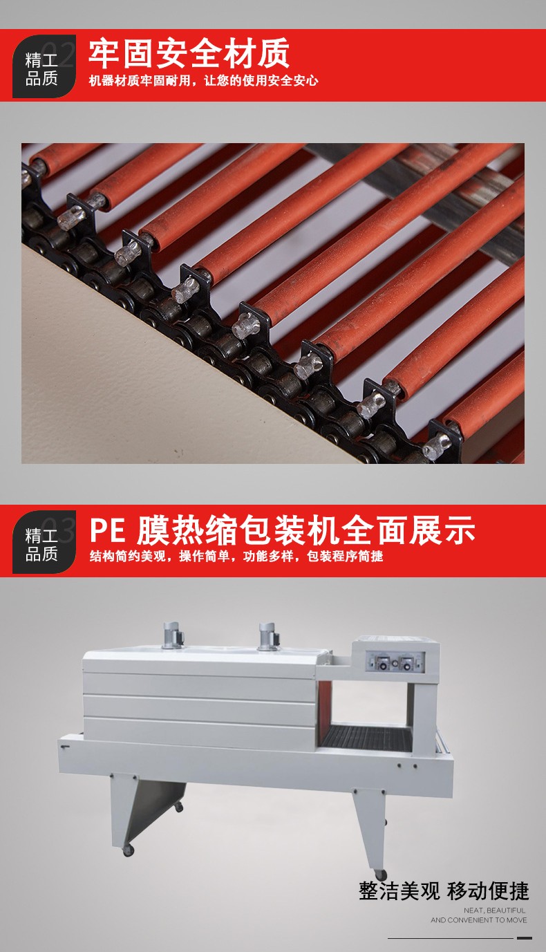 加熱原理:機器內部的加熱裝置(通常是加熱管)會將空氣加熱。當 PE 薄膜包裹產品并進入加熱區域后,熱空氣使薄膜分子獲得能量。PE 薄膜分子鏈在熱能作用下開始運動,分子間的距離縮小,進而產生收縮現象。一般來說,PE 薄膜的收縮溫度在
