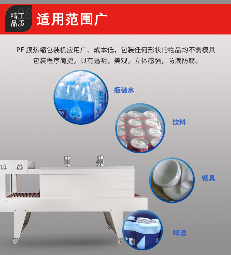 - 適用范圍廣:可以用于包裝各種形狀和尺寸的產品,無論是規則的圓柱體、長方體,還是不規則的產品,只要選擇合適的 PE 薄膜,都可以用這種機器進行包裝。而且它可以與其他包裝設備和生產線集成,實現自動化包裝,提高生產效率。