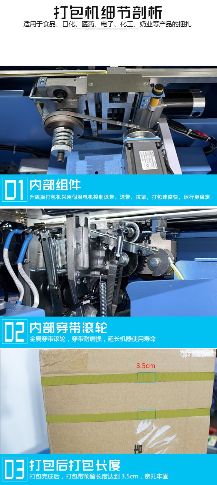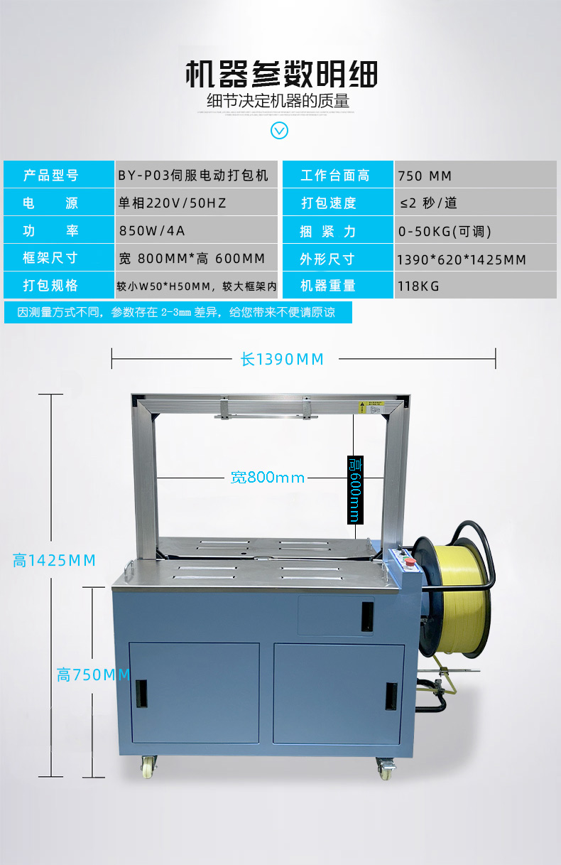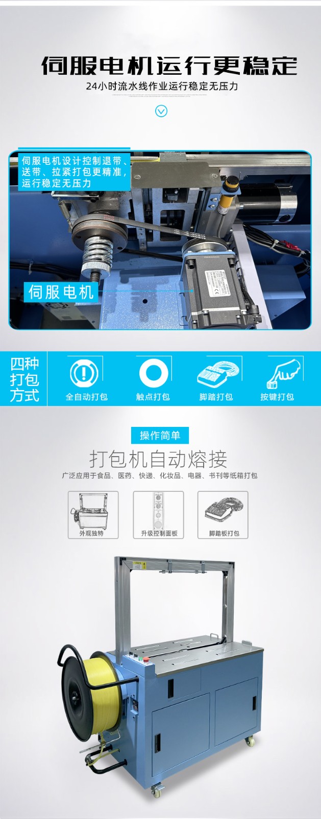 - 捆扎打包:根據預設的參數,伺服電機驅動打包帶圍繞物品進行捆扎。在捆扎過程中,伺服電機精確控制打包帶的張力,確保打包帶能夠緊密地貼合在物品表面,同時又不會對物品造成損壞。完成捆扎后,切斷機構會自動將打包帶切斷,并對末端進行熱封或其他方式的處理,防止打包帶松開。