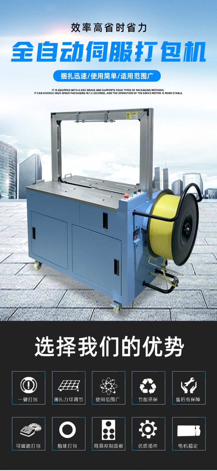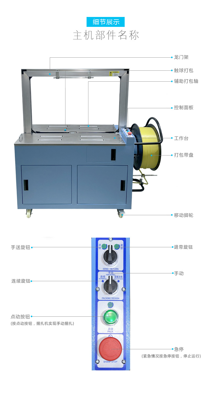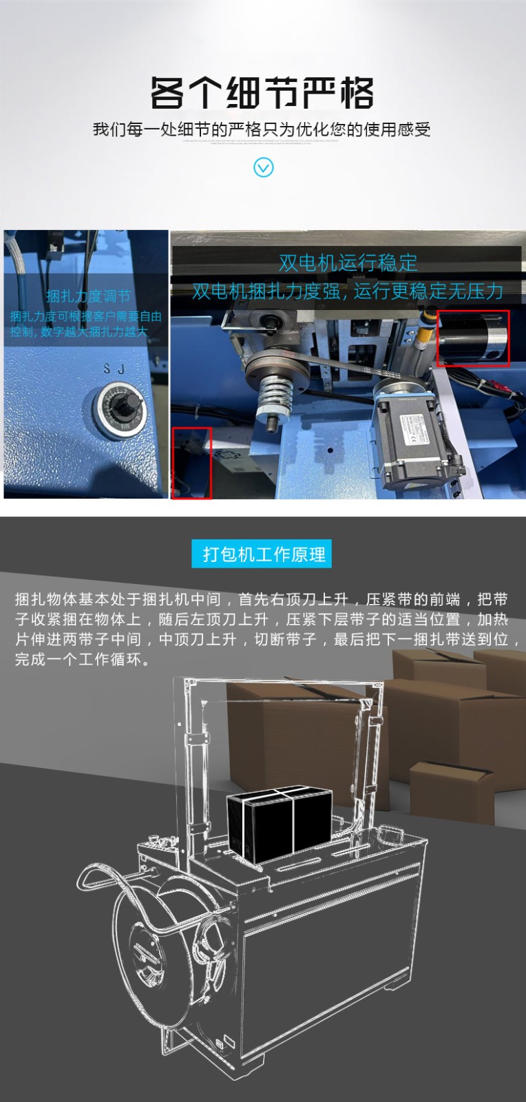 控制系統:負責智能化管理整個捆扎流程。通過傳感器與程序控制,實時監測并調整捆扎速度、張力等參數,用戶還能依不同產品需求設定相應捆扎參數,滿足多樣化包裝需求。