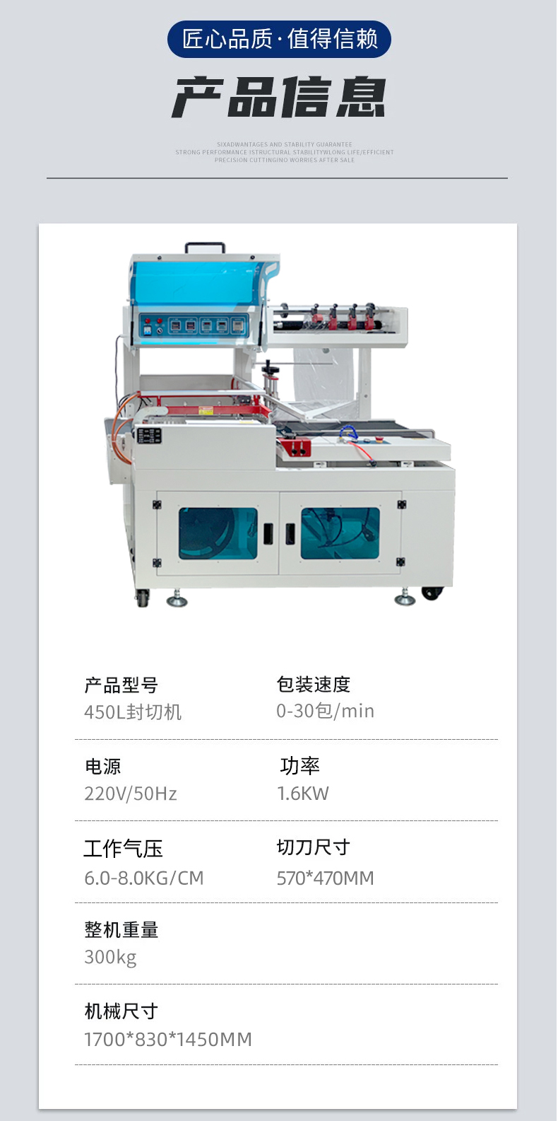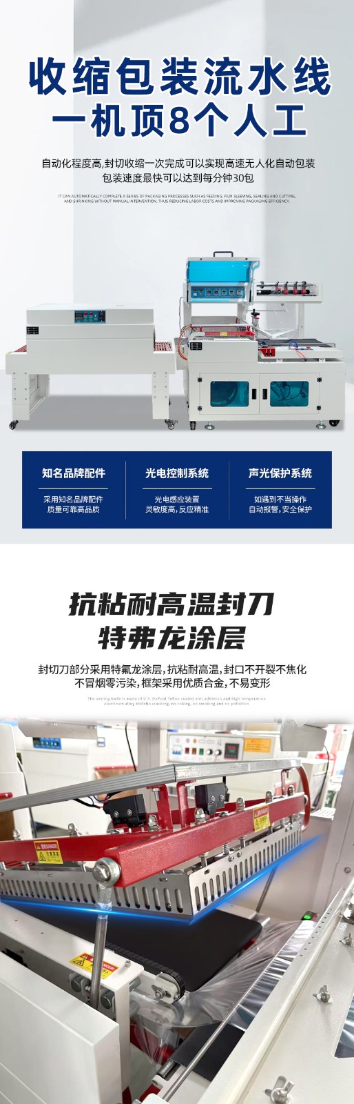 - L 型封切刀確保膜的封邊平整、無(wú)毛邊,熱收縮后膜與產(chǎn)品緊密貼合,無(wú)褶皺、無(wú)氣泡,不僅提升產(chǎn)品外觀檔次,還能實(shí)現(xiàn) “防水、防塵、防氧化”,延長(zhǎng)產(chǎn)品保質(zhì)期(尤其適合食品、醫(yī)藥行業(yè))。