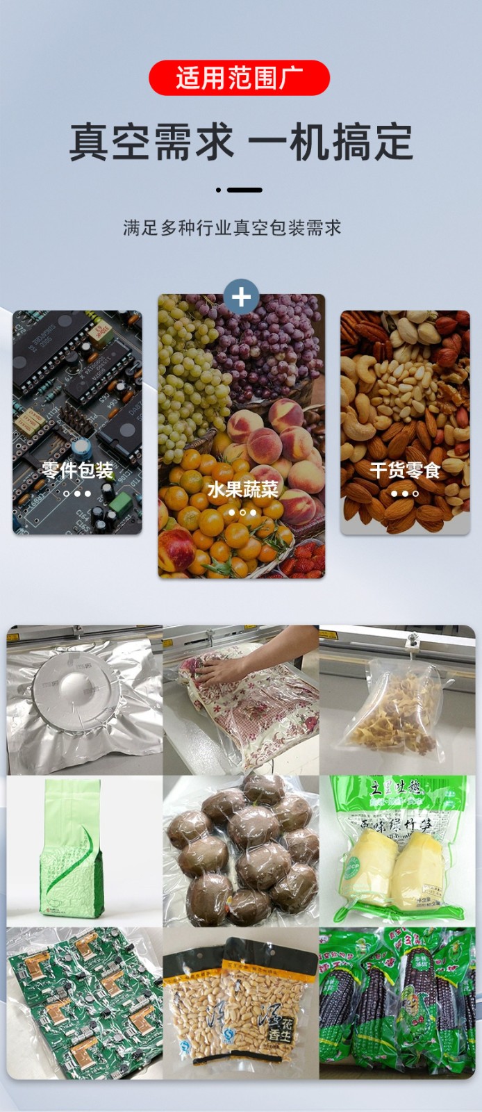 - 工業(yè)領(lǐng)域:大型機械零件、金屬構(gòu)件、整箱電子元件的真空包裝,防止運輸中受潮、生銹。