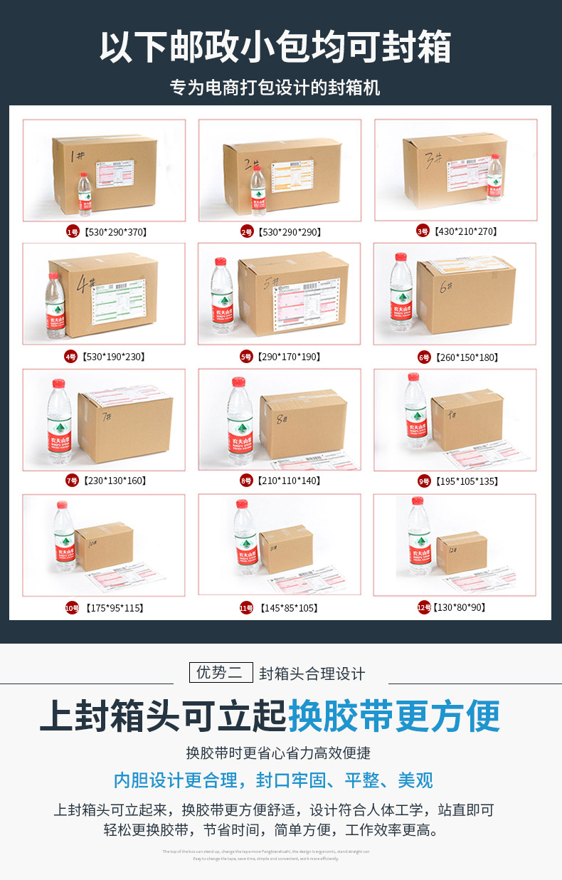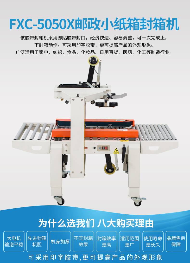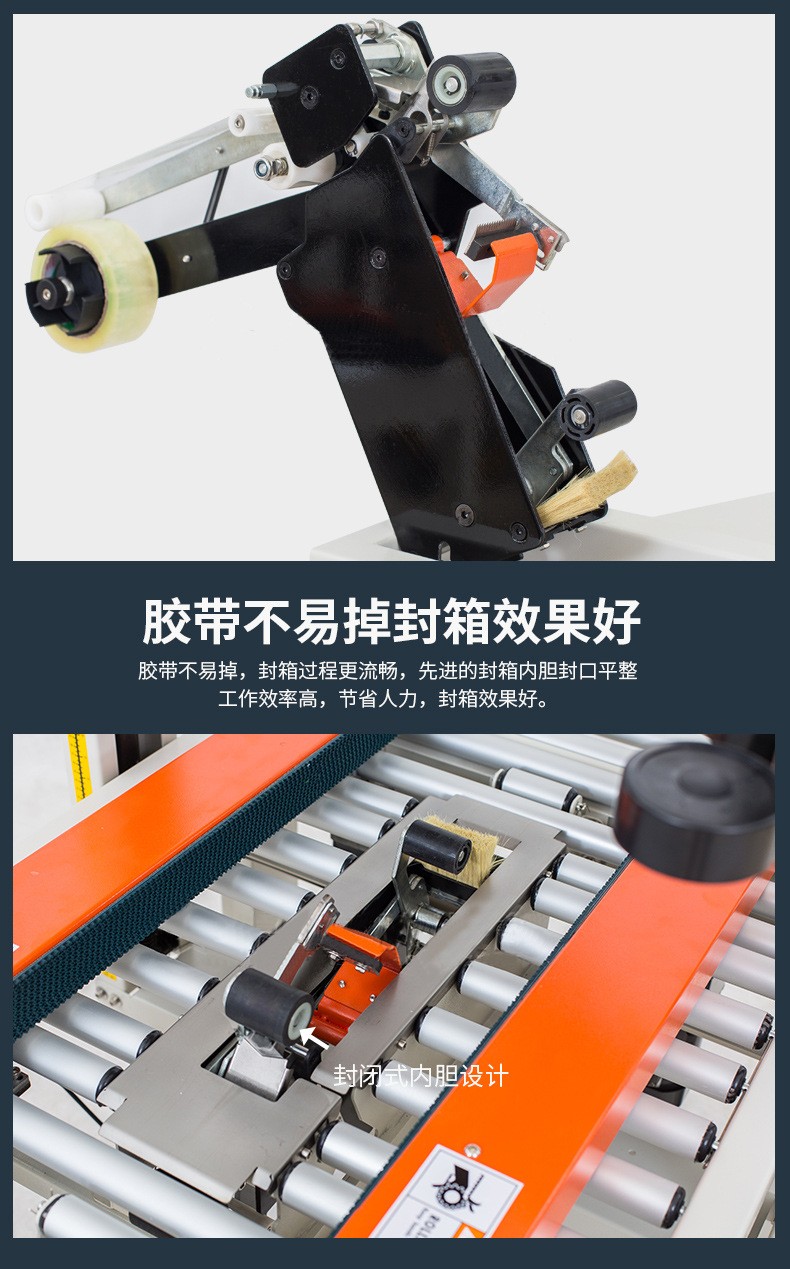 封箱機(jī)主要適用于紙箱的封箱包裝,既可單機(jī)作業(yè),也可與流水線配套使用,它可單箱作業(yè),也可與紙箱成型開箱機(jī)、裝箱機(jī)、貼標(biāo)機(jī)、捆包機(jī)、棧板堆疊機(jī)、輸送機(jī)等設(shè)備配套成包裝流水線使用,為包裝流水線作業(yè)必須的設(shè)備