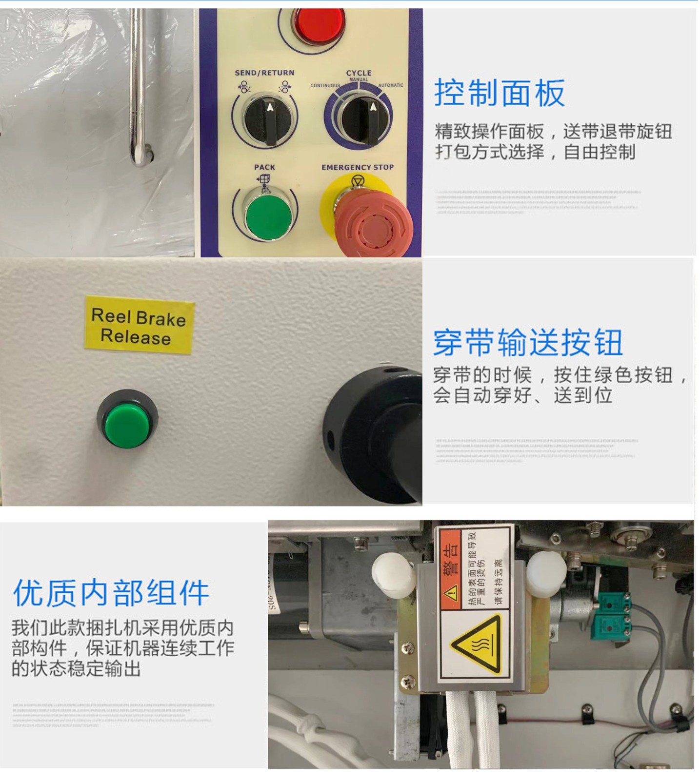 打包機的功能是使用捆扎帶纏繞產品或包裝件收緊并將兩端通過熱效應熔融或使用包扣等材料連接